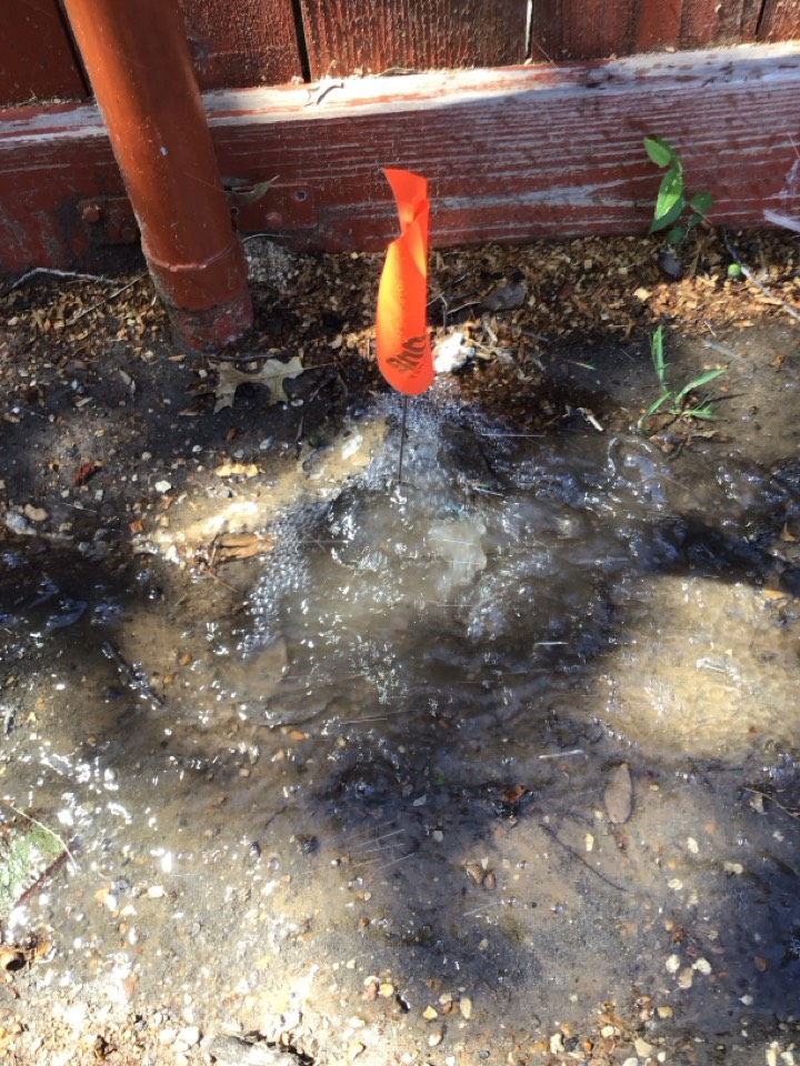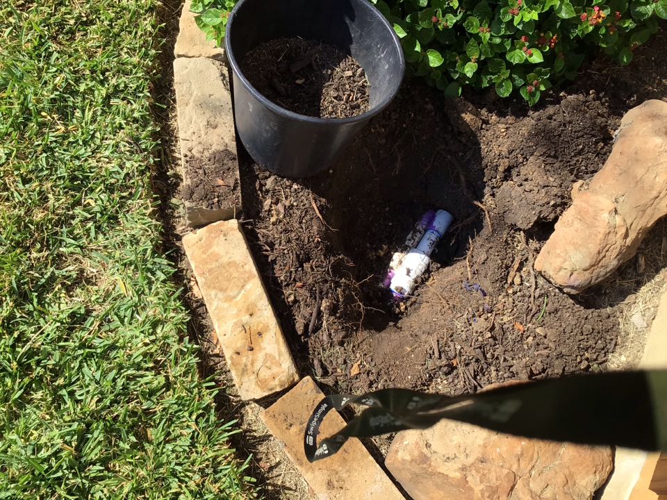 Dug up, repaired and buried 1” main line leak by front left corner of the house that was leaking constantly causing water running down retaining wall and could have cause an increment in water bill, left DCA off to let glue to fully cure, replaced missing nozzle in front yard he screwed back in one spray head on left side of house on previous visits.